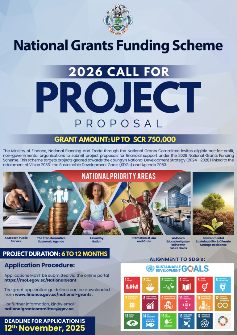 Through this scheme, eligible organisations are invited to submit project proposals that align with key national priorities and development goals. Successful applicants may receive grant funding of up to SCR 750,000 to implement projects with a duration ranging from 6 to 12 months